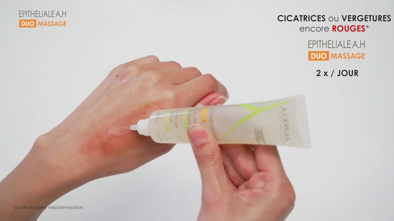 Οι ουλές* και οι ραγάδες αποτελούν αναμνήσεις σημαντικών γεγονότων της ζωής που είναι μέρος του δέρματος. Με δύο εφαρμογές την ημέρα, το EPITHELIALE A. H έλαιο για μασάζ κατά των δερματικών σημαδιών βοηθά στη μείωση της εμφάνισής τους. Η κατοχυρωμένη με δίπλωμα ευρεσιτεχνίας** υφή του ελαίου σε μορφή ζελ διανέμεται και εφαρμόζεται εύκολα, δεν τρέχει και προετοιμάζει το δέρμα για τη μέθοδο μασάζ «ψηλάφησης-κύλισης». Δύο έως τρία λεπτά κατά τη διάρκεια των οποίων το ζελ διαλύεται και μετατρέπεται σε έλαιο μασάζ. Γιατί μασάζ; Επειδή διεγείρει και ευνοεί την μικροκυκλοφορία, βελτιστοποιεί την ενυδάτωση και μειώνει το αίσθημα τραβήγματος και κνησμού. Η σύνθεση του EPITHELIALE A.ελαίου για μασάζ κατά των δερματικών σημαδιών δεν περιέχει σιλικόνη και αιθέρια έλαια. Αποτελείται από εννέα μόνο συστατικά 98% φυσικής προέλευσης. Βελτιώνει την εμφάνιση των δερματικών σημαδιών στο 100%¹ των ατόμων. Ιδανικό για όλη την οικογένεια. Συνιστάται για έγκυες γυναίκες.